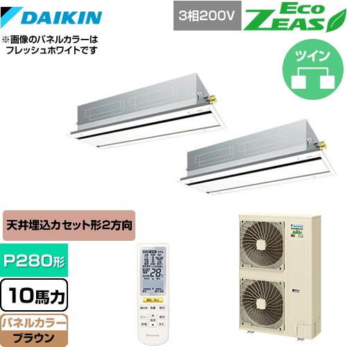| 仕様・ 特徴 | 直線的にすっきりおさまる洗練されたフラットパネル 天井埋込カセット形 エコ・ダブルフロータイプ P280形 10馬力相当 ツイン 三相200V ワイヤレスリモコン 冷房能力:25.0(11.3~28.0)kW 暖房能力:28.0(12.6~35.0)kW 冷媒:R32 パッケージエアコン 風向独立フラップ 清潔アルミフィン フレアレスジョイント |